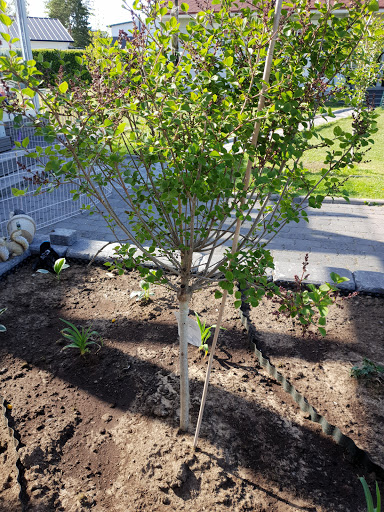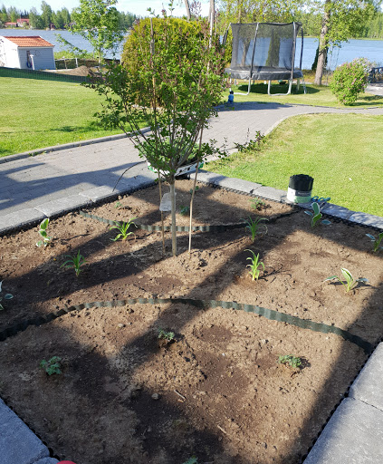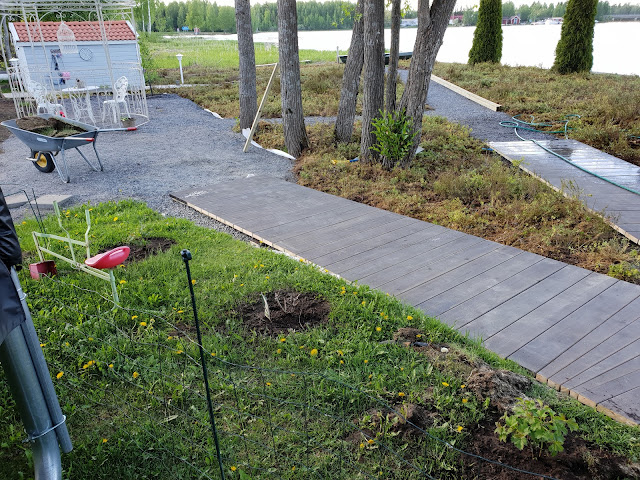 Vasemmanpuoleisen polun varteen istutettiin kaksi Lumipalloheisiä ja yksi punavalkoisella kukalla kukkiva Syyshortensia. Sora-alueen vierellä olevaan maahan kaivettiin kodit luumu-, kirsikka- ja päärynäpuille. Odotan niin innolla, että puut viihtyisivät hyvin ja saataisiin jotain satoa jo ensi vuonna.