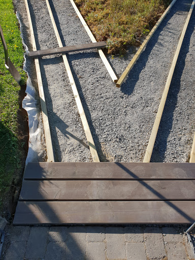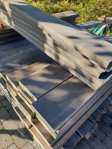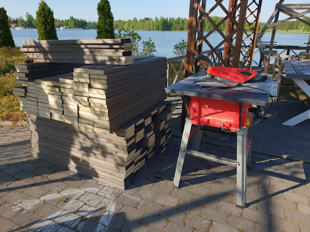 Tilattiin Starkilta kotiinkuljetuksella valmiiksi käsiteltyä, kyllästettyä ja karhennettua lautaa, kuntan läpi tehtäviä kävelysiltoja varten. Puu on ihanan harmaata ja sopii maisemaan valtavan hyvin.