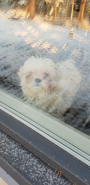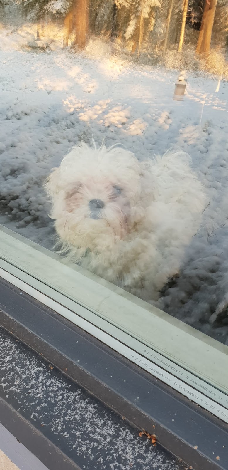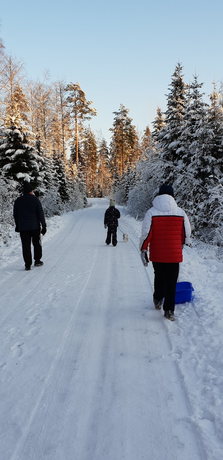 Kotona ruoho vihersi, kun lähdettiin reissuun, mutta mökillä oli täysi talvi ja lisää lunta satoi koko ensimmäisen illan. Kaivettiin esiin pulkat ja potkukelkka, joilla saikin mainiot vauhdit molemmilla.