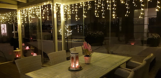 Mun mies on lumilyhtyjen innokas tekijä ja heti, kun maassa on sen verran valkoista, että siitä saa lyhdyn, komeilee sellainen varmasti meidän pihalla. Joulupäivän illan lumesta mieheni taiteli tunnelmapolun kotoa saunalle. Punaisilla kynttilöillä tietysti.