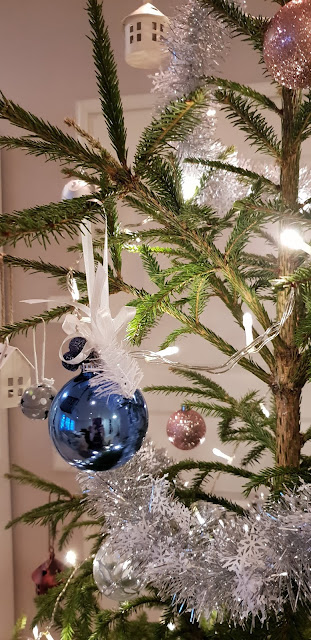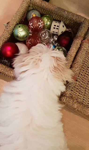 Joulukuusi tuotiin sisään aattoa edeltävänä perjantaina ja koristeltiin saman tien. Vaikka meidän lapset innokkaita koristeluhommiin aina ovatkin, taisi tänä vuonna innokkaimman koristelijan mantteli mennä pikku koiralle. Ainakin pieni karvainen pää oli joka ikisessä korissa, mikä vaan sattui sopivasti kohdalle ja pätkän suussa oli milloin mitäkin köynnöstä ja kimallepalloa.