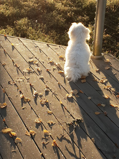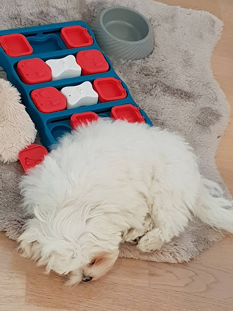 Luulin, että meidän eka koira oli pienenä vilkas, mutta en ollut nähnyt vielä mitään. Tämä tuorein tulokas on liikkeessä koko hereilläoloaikansa. Ja tarkoitan ihan kunnolla liikkeessä. Kuin pieni valkoinen hyrrä pyörisi ympäri lattioita, tarttuen välillä ohikulkeviin jalkoihin kiinni. Happy on aivan yli-innokas ihan kaikkeen. Välillä tuntuu, kuin koko koira irtoaisi kohta nahoistaan, kun meno on niin reipasta.