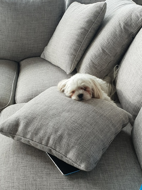 Hoitotoimet ovat menneet mutkattomammin, kuin odotin. (Kop kop). Turkinhoitoa pentu ihan odottaa, kun otan pöydälle ekaksi aina vanhemman. Happy makaa jaloissa ja katselee silmä tarkkana, koska on hänen vuoronsa. Harjauksiin ja silmien putsauksiin menee kerralla noin kolme varttia. Kynnen leikkuut ja pesukerrat ovat vielä erikseen.