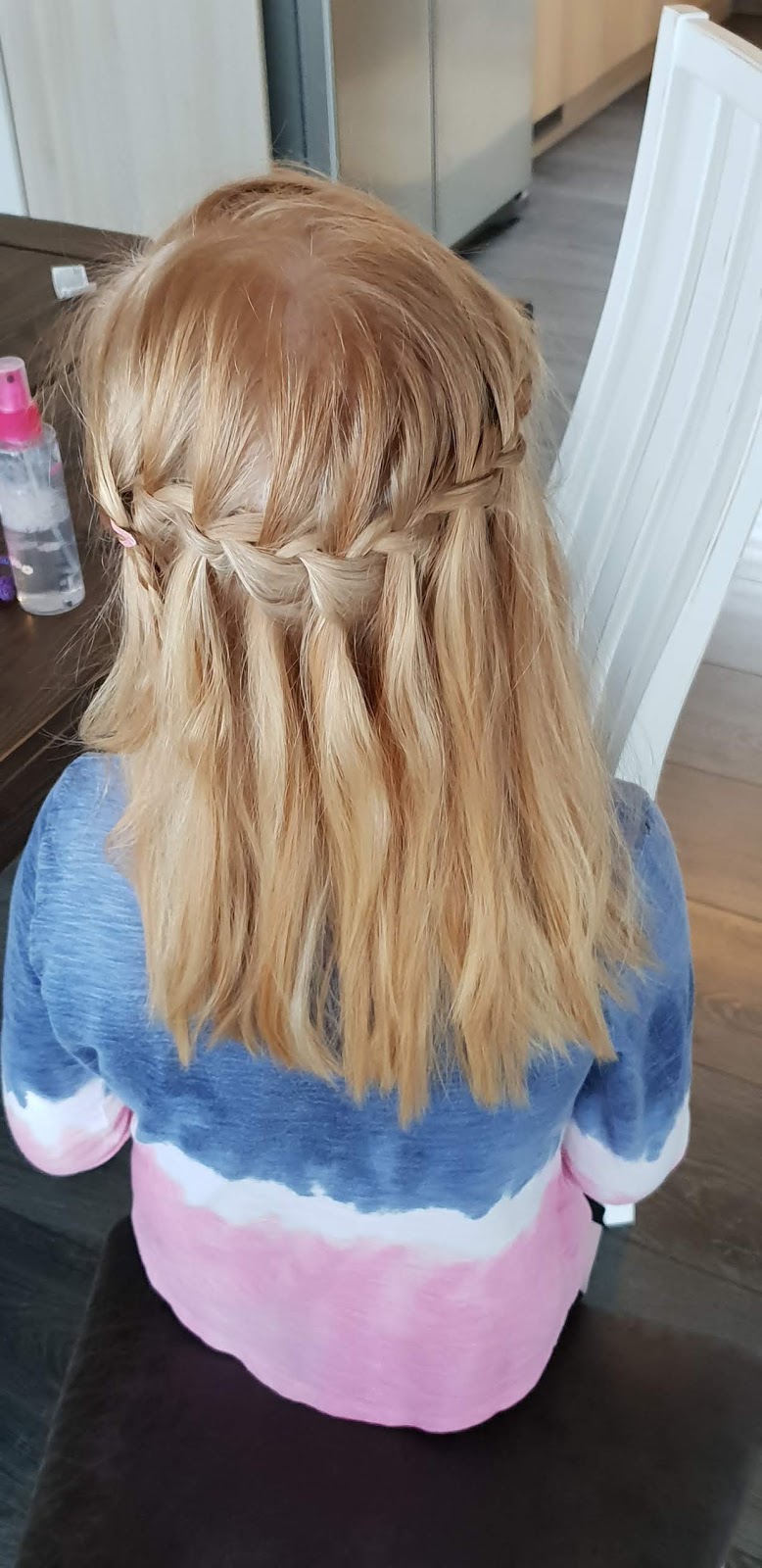 Yritän aina harjoitella jotain uusia kampaustyylejä hänen hiuksiinsa. Osa onnistuu hyvin, osa vähemmän hyvin. Tässä harjoittelin tänään putouslettiä : )
