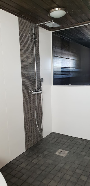 Kun sauna sitten oli ihan tumma ja kylpyhuoneen seinät valkoiset, laajennettiin tuo vahakäsittely koko tilan kattoon. Tumma katto antaa kyllä kivan kontrastin muuten vaaleille väreille.
