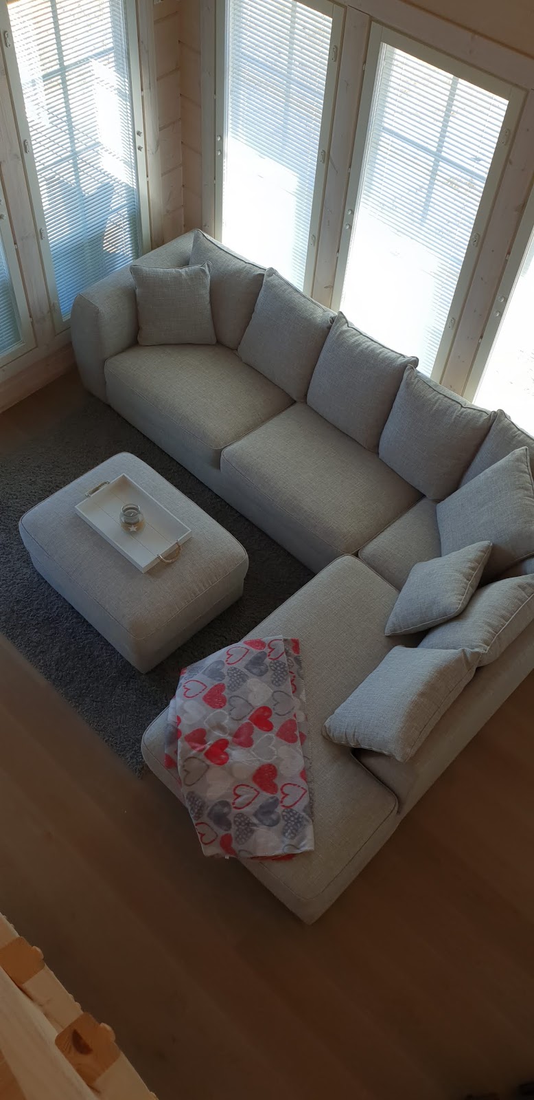 Meille rakennettiin nelisen vuotta sitten pihasauna Finnlamellin mallistosta. Haluttiin samalla myös yövieraille nukkumatilaa, joten haettiin 1½-kerroksista versiota.
