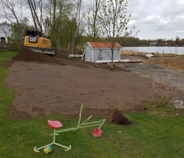 Viime viikonloppuna kaivuri hääri parina päivänä uutterasti meidän pihassa. Täytyy tässä vaiheessa jo antaa suuri kiitos alansa ammattilaiselle. Sama firma (Lempäälän Maa- ja Vesirakennus Oy) on käynyt ennenkin tekemässä meillä maanrakennushommia ja heiltä kyllä käy työ niin sujuvasti. Aikataulut pitävät ja jälki on aina huolellista sekä siistiä.