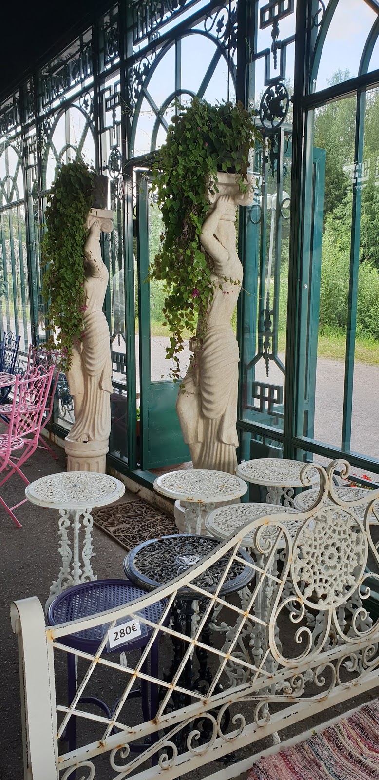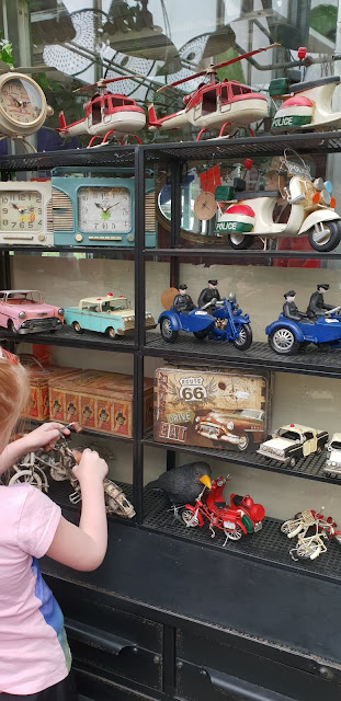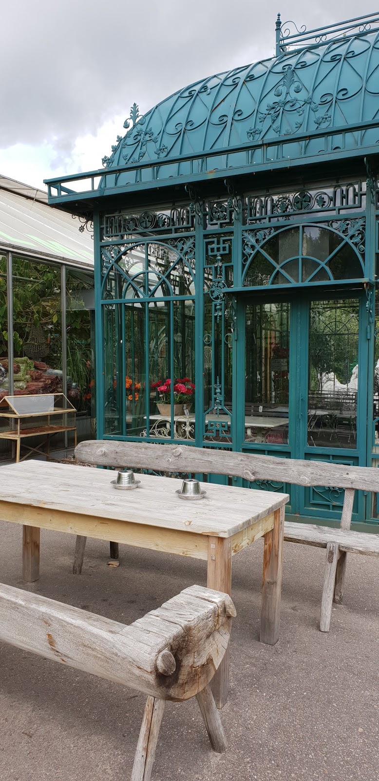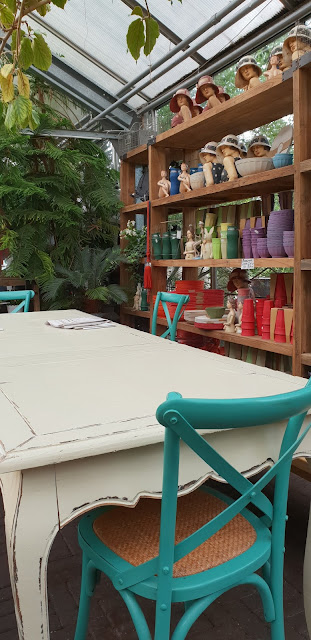 Kahvilassa ja tässä suuressa lasiseinäisessä huvimajassa oli ihana sekoitus erinäköisiä, erikokoisia ja erivärisiä kalusteita. Lapsista oli kiva valita, millä penkeillä milloinkin istuttiin evästämässä.