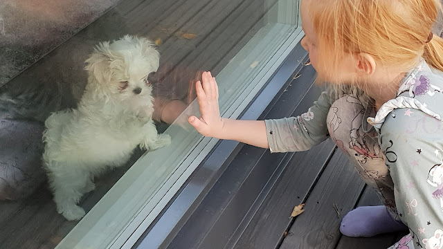 Koira nautti täysin siemauksin uudesta ympäristöstä ja katseli innoissaan lattiaan saakka olevista ikkunoista ulos.