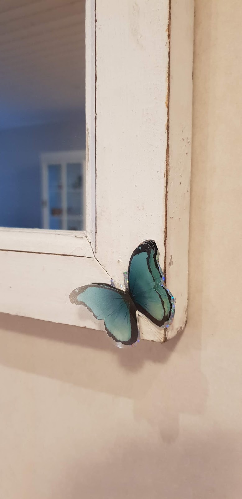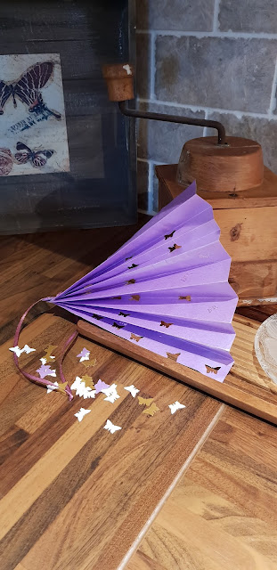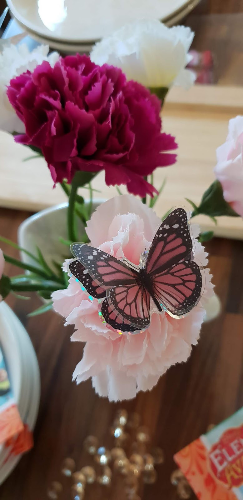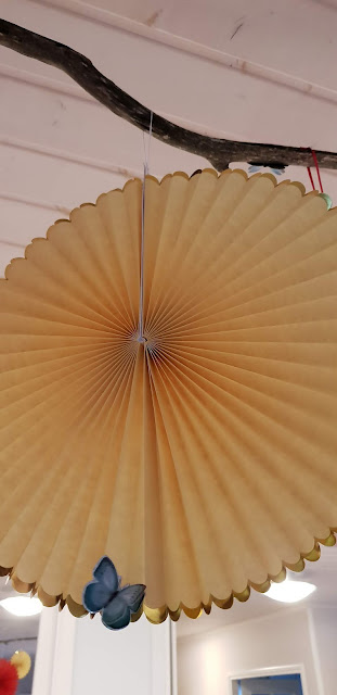 Sinellistä löysin noita ihania 3D-perhosia, joita sitten laittelin eri paikkoihin. Tuohon kuvan oksaan, viuhkoihin, kukkiin ja tarjoilulautasten reunoille.