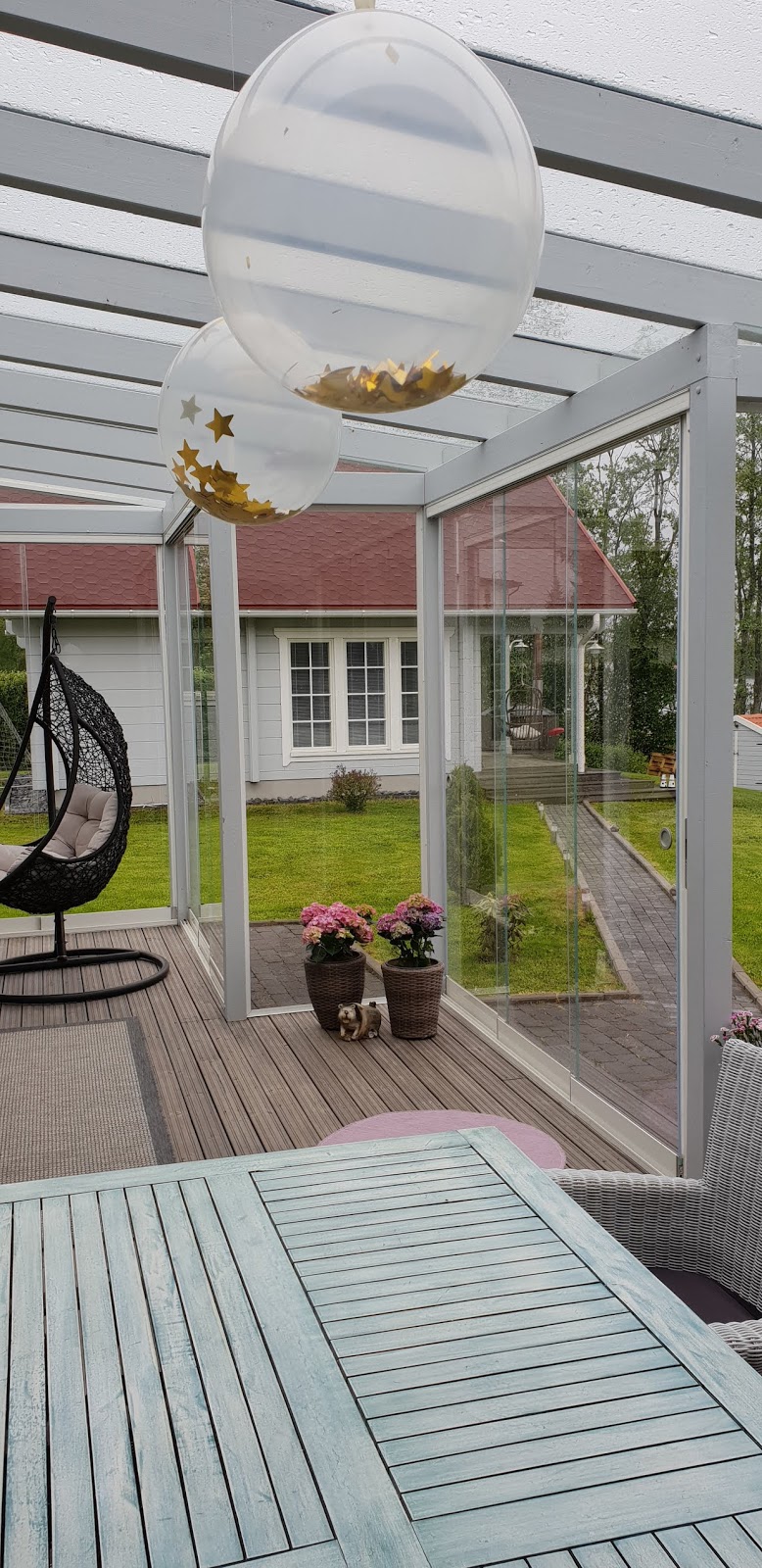 Muina vuosina meitä on hellitty aurinkoisemmalla säällä, mutta ei se ollut huono tällainen sateinen ja pilvinenkään. Viileys taitettiin lasiterassilta parilla lämmittimellä, joten sielläkin tarkesi istua kahvittelemassa.