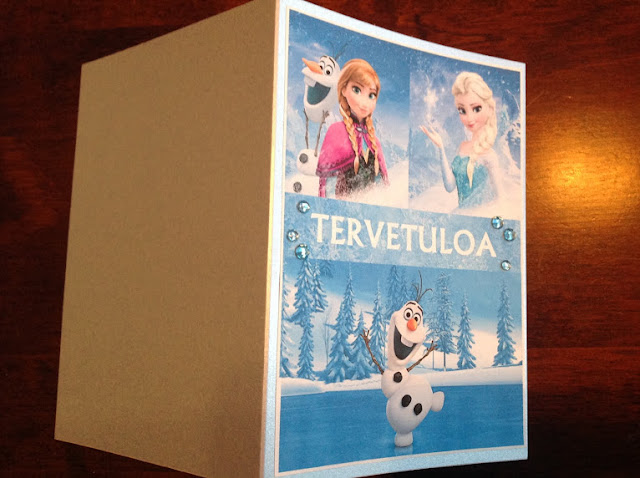 Muistan hyvin nuo Frozen-synttärit, kun yritin tehdä lämpimälle päivälle jääkoristeita. Leikkasin mehujäämuotteihin, yhteen rengasvuokaan ja pikku ämpäriin kuvia Frozen-pahvilautasista ja laitoin ne muottien reunoihin kiinni pyykkipojilla, sitten vettä perään ja pakastimeen vuorokaudeksi. ”Rengasvuokakakkuun” ripottelin vielä veden sekaan jääaiheisia konfetteja ja nonparelleja.