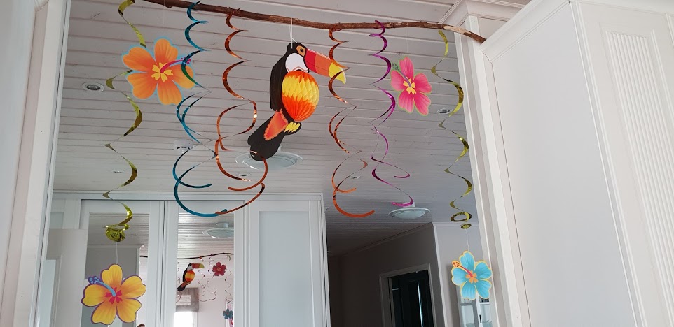 Synttärikuninkaalla oli Hawaiji-henkeen aivan mahtavia vesimelonilautasia ja ananaskoristeita. Ja tuo oksan koriste on myös samasta nettikaupasta.