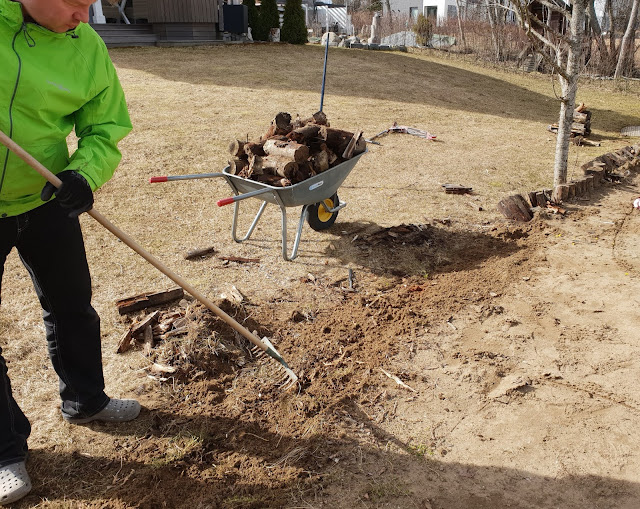 Meidän alapihalla on ollut suurehko hiekkalaatikkotyyppinen systeemi, joka oli alkujaan tarkoitettu lasten hiekkaleikki- ja pelialueeksi. Vuorattiin vuosia sitten pohja kankaalla, reunustettiin alue puunkaadosta jääneillä rungonpätkillä ja tilattiin läjä hiekkaa kaiken kukkuraksi. Viimeisen parin vuoden aikana aluetta ei ole kuitenkaan käytetty oikein mitenkään. Trampoliini siinä on ollut, mutta sekin vie vain yhden kolmasosan hiekkatilasta. Niinpä päätettiin vihdoin ottaa alue suurempaan hyötykäyttöön.